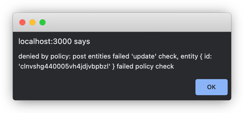 You may have noticed that a user can publish, unpublish, or delete other user's posts from the UI. That's because we haven't implemented any conditional rendering logic yet. However, if you try to do that, the server side will reject the request and keep the data safe. In a real application, you'll want to capture the error and show a proper message to the user.